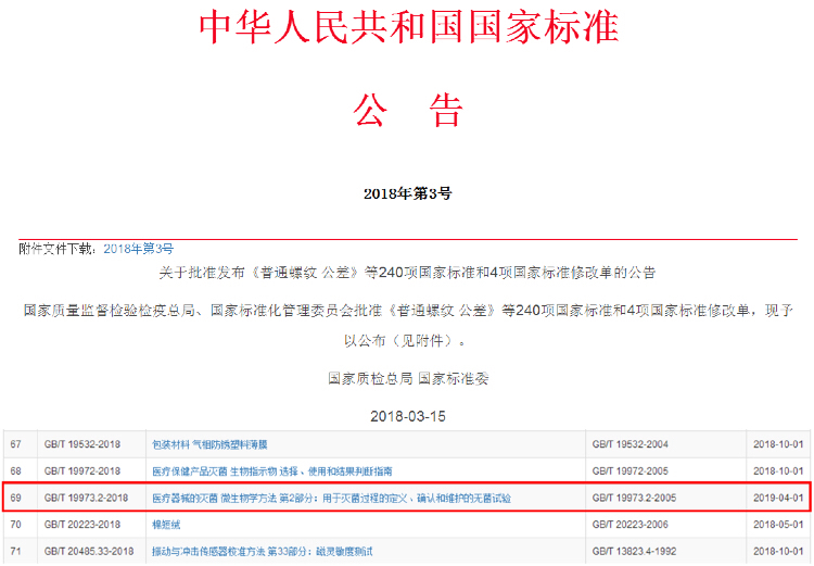 3月15日,国家质量监督检验检疫总局、国家标准化管理委员会发布2018年第3号中国国家标准公告,对新一批国家标准予以公布,其中包括了由8868体育为第一起草单位的国家标准《医疗器械的灭菌 微生物学方法 第2部分:用于灭菌过程的定义、确认和维护的无菌试验》。