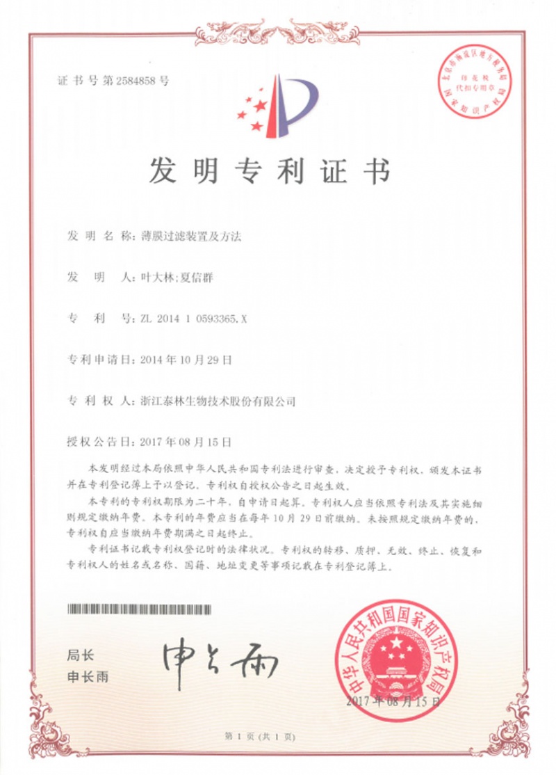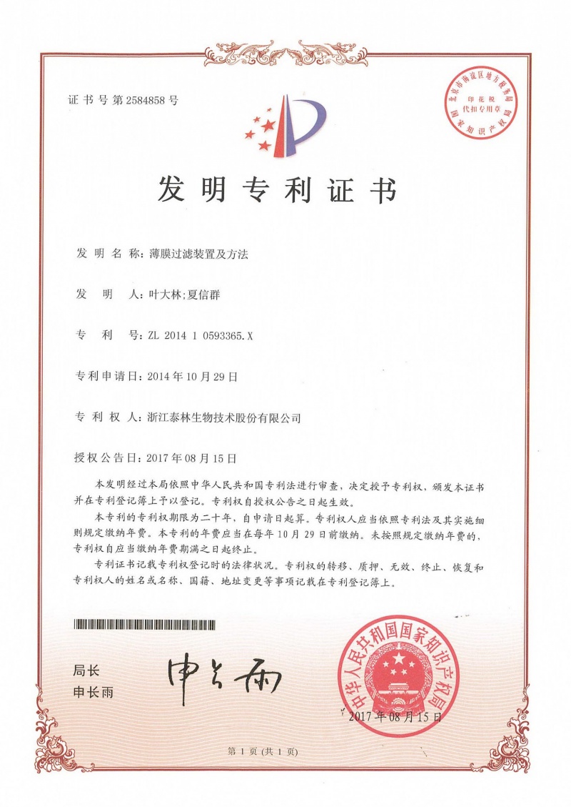 薄膜过滤装置及方法ZL 2014 1 0693365.X -