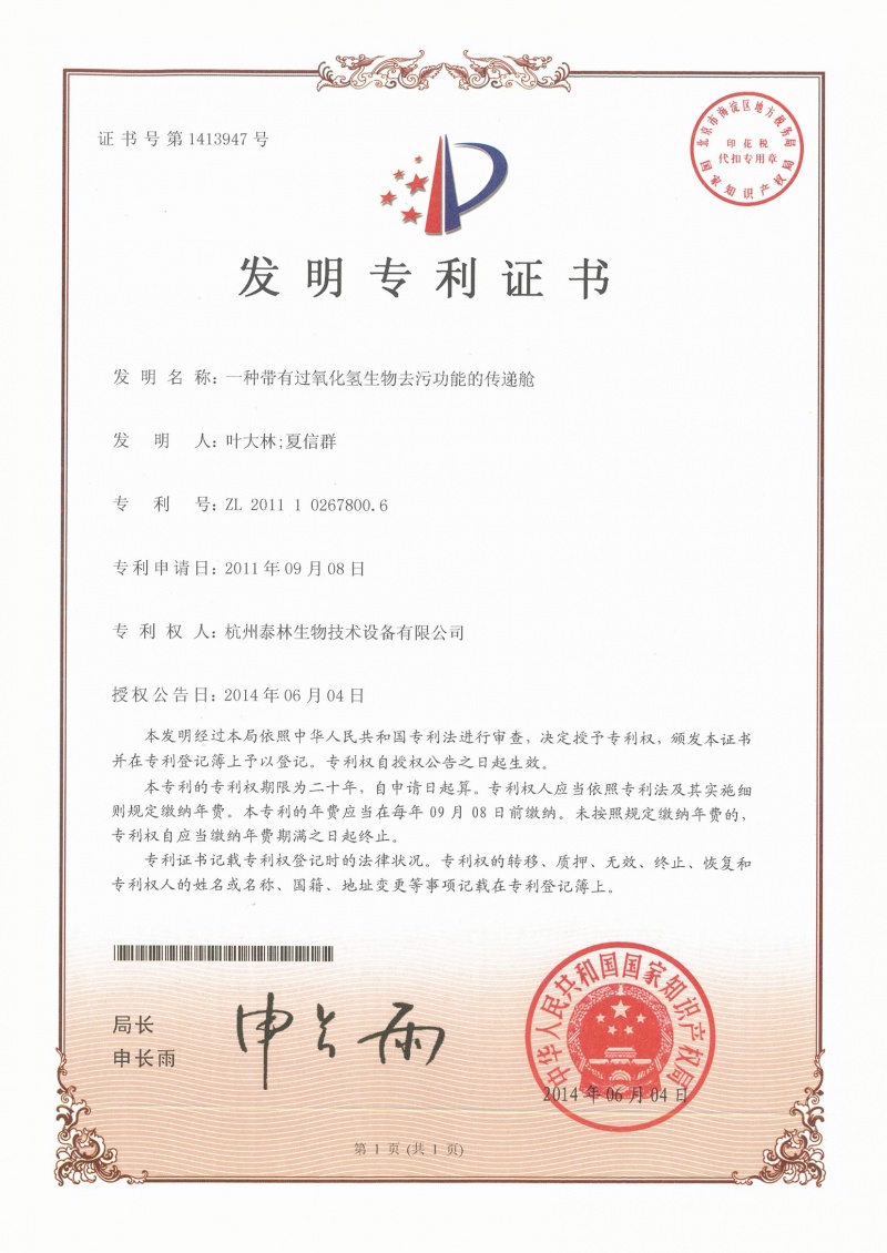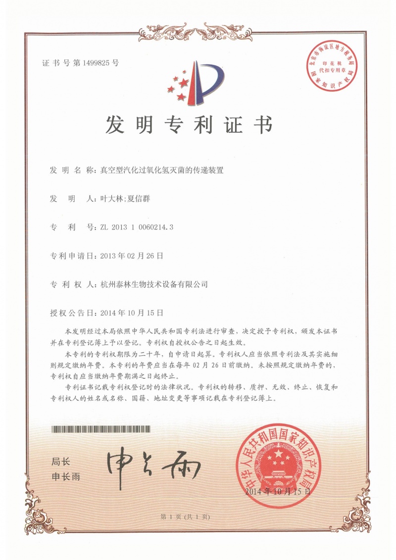 真空型汽化过氧化氢灭菌的传递装置ZL 2013 1 0060214.3 -