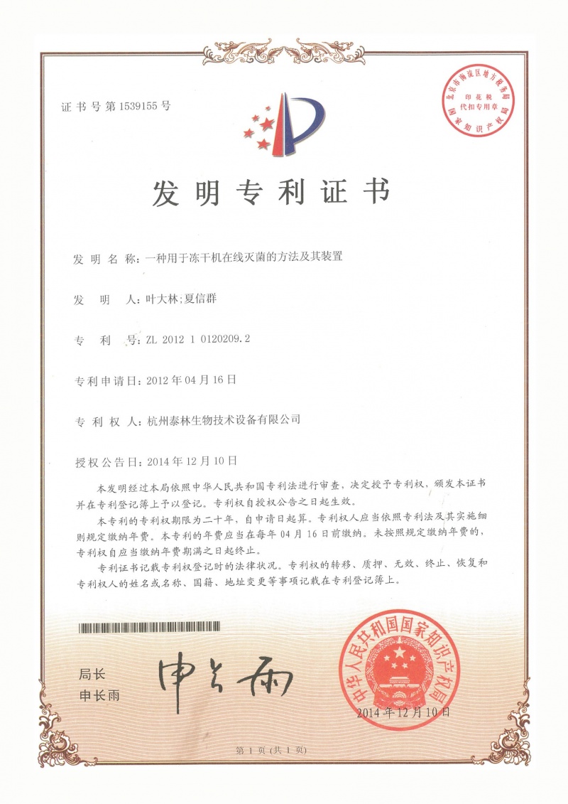 一种用于冻干机在线灭菌的方法及其装置ZL 2012 1 0120209.2 -
