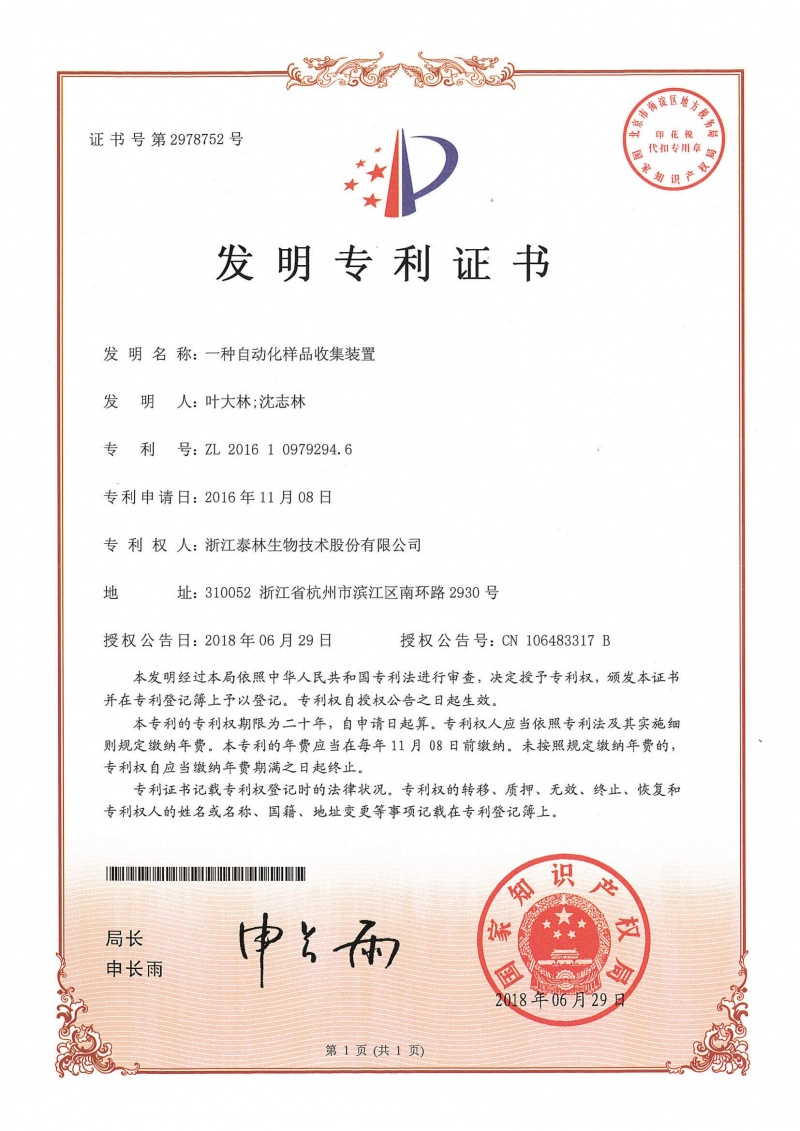 一种自动化样品收集装置ZL 2016 1 0979294.6 -