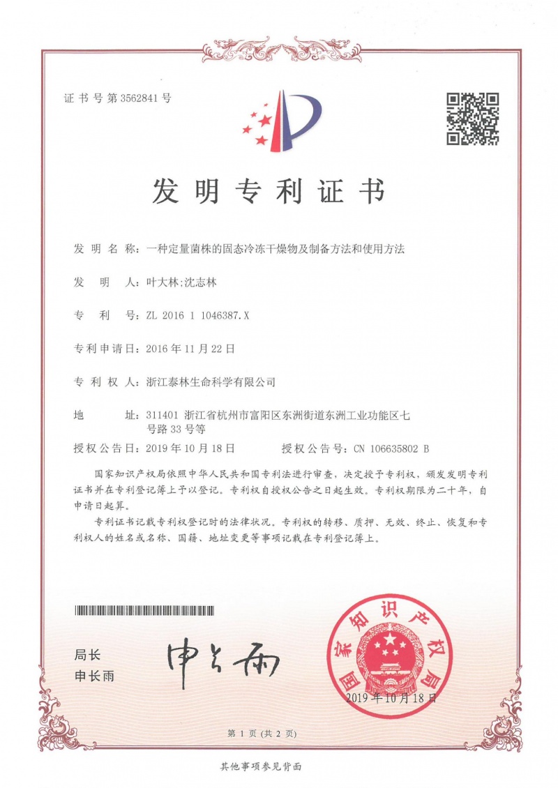 一种定量菌株的固态冷冻干燥物及制备方法和使用方法ZL 2016 1 1046387.X -