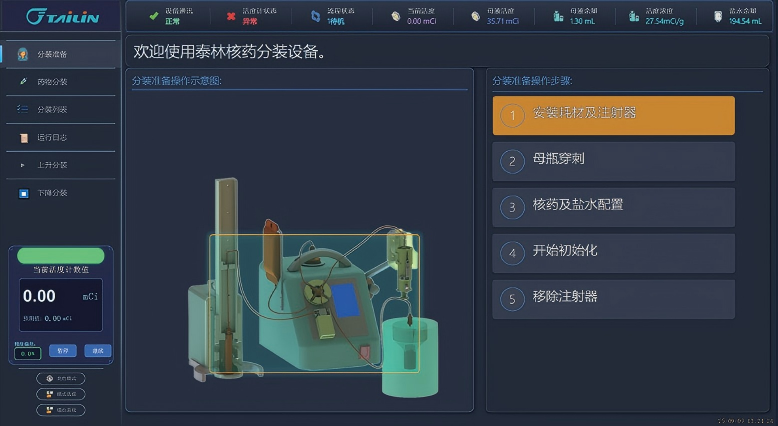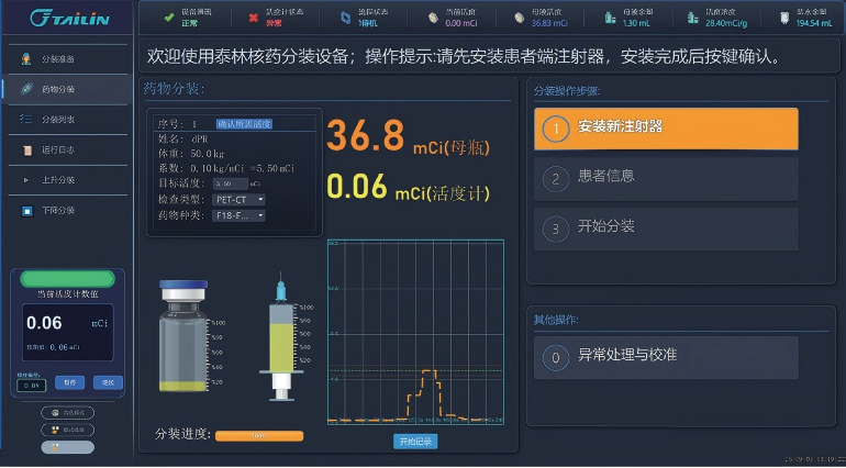 使用时先安装一次性卡套并连接管路,设备自动完成母液活度、体积测量,自动完成液路排气等初始化步骤,在屏幕上输入患者体重,设备开始分装。